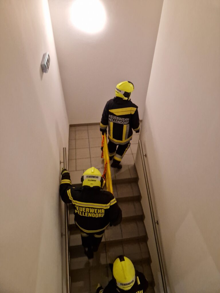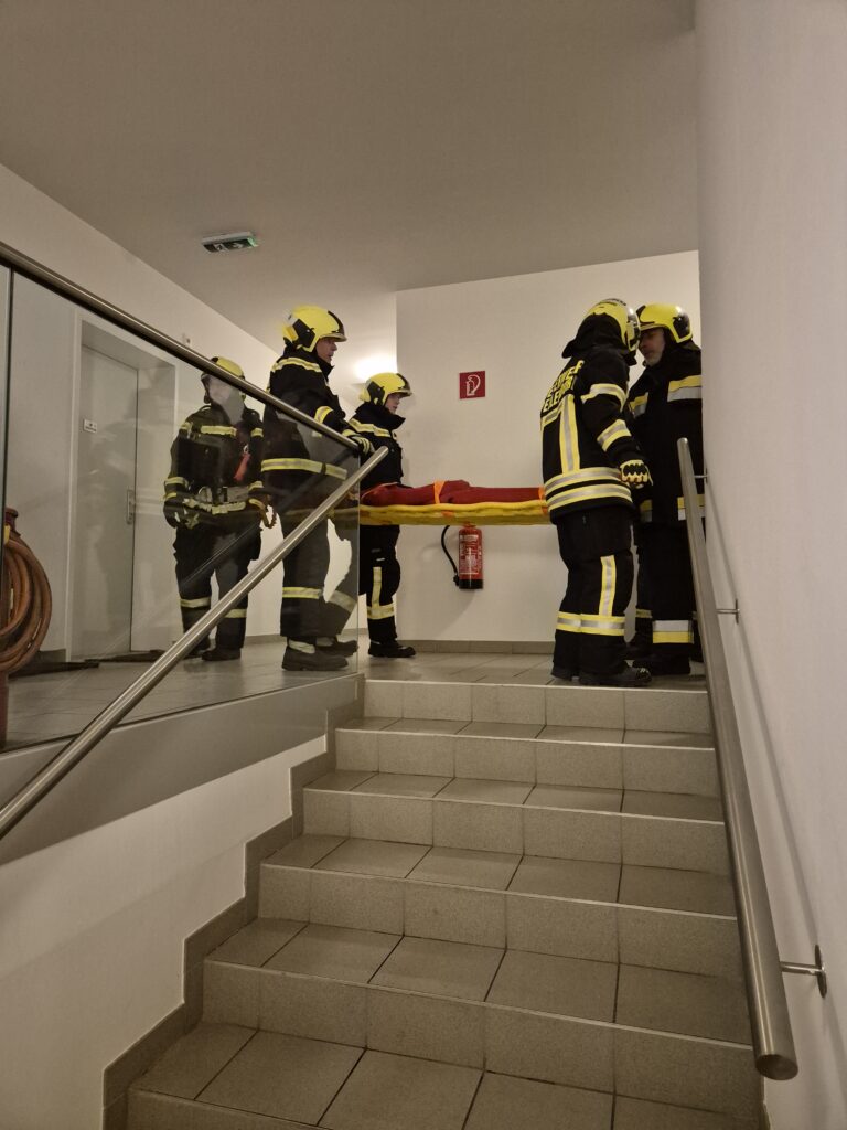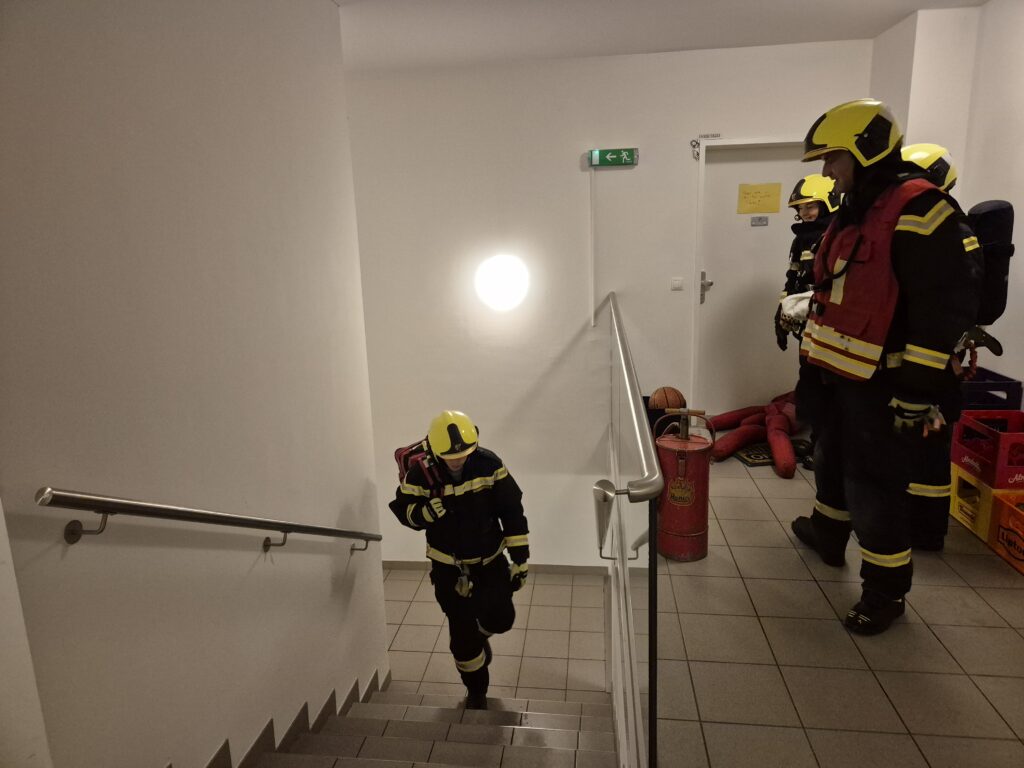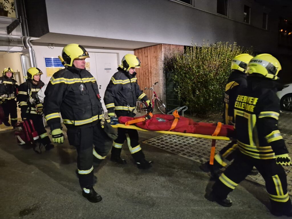 Wohnungsbrand im 2. Stock mit Menschenrettung. Zwei Atemschutztrupps im Innenangriff – Person bewusstlos aufgefunden. Erstversorgung durch Feuerwehrsanitäter, Rettung mittels Spineboard und Übergabe an das Rote Kreuz.